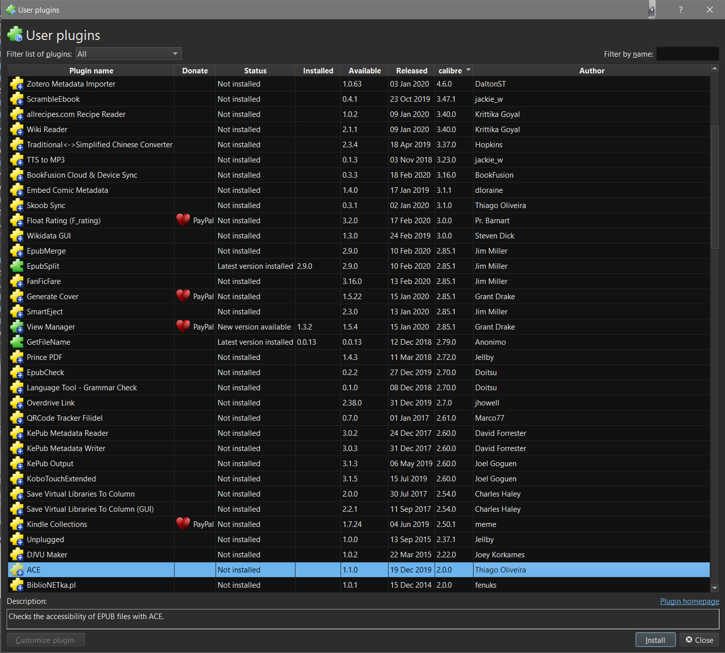 Since Calibre continues to change its internal libraries imported into and hence used by some Plugins, those impacted Plugins necessarily must change concurrently. Attached to this specific post are all of the final Calibre Python 2-compatible and Calibre < 3.41.1[*] compatible Plugin installation .zip files for my personal Plugins. I stashed these "final" copies on April 21, 2019 after Kovid indicated that Python 3 was on the horizon, and before I began to use the Calibre Polyglot library to convert from Python 2 to Python 3. Calibre 3.41.0 was the current Calibre version on that date. The Calibre Polyglot library's builtin functions were being enhanced frequently thru at least August 2019. All the plugins below heavily use Polyglot builtin functions. Calibre 3.41.3 changed its PDF to HTML extraction function, requiring corresponding changes in some of the plugins, as well as many Python 3 compatibility changes that raised the minimum version. The Qt version used in Calibre 4.0 was jumped to Qt 5.13, causing deprecation of QtWebKit previously used by both Calibre and one of the plugins below for the purpose of editing in HTML. Calibre 4.0+ also saw deep changes in some Calibre libraries that many of these Plugins used, causing their minimum supported Calibre version to increase. If history is any indication, Calibre 5.0+ likely will cause further increases in the minimum Calibre version required. After installing these, you might want to back up your entire Calibre configuration directory to an external drive, since these Plugins have JSON configuration files that you customize to your taste, plus other resource files. Calibre has a menu option to do so. These are all unsupported and deprecated. Those that use web-scraping to download metadata (e.g. Library Codes) may no longer be functional due to website changes. Use these only if you absolutely must. DO NOT USE THESE ABOVE Calibre 3.48. For a deep backup of my plugins with a minimum Calibre Version of 4.6, see: https://www.mobileread.com/forums/sh...9&postcount=21 For a deep backup of my plugins with a MAXIMUM Calibre Version 5.98.99, see: https://www.mobileread.com/forums/showpost.php?p=4191349&postcount=25 DaltonST [*] Some of these might work just fine in Calibre 3.48, the final version before Calibre 4.0. They were never tested with 3.48, but it is possible some might be compatible. Last edited by DaltonST; 01-20-2022 at 03:42 PM. Reason: For a deep backup of my plugins with a MAXIMUM Calibre Version 5.98.99, see: https://www.mobileread.com/forums/showpost.php?p=4191349&postcount=25 |