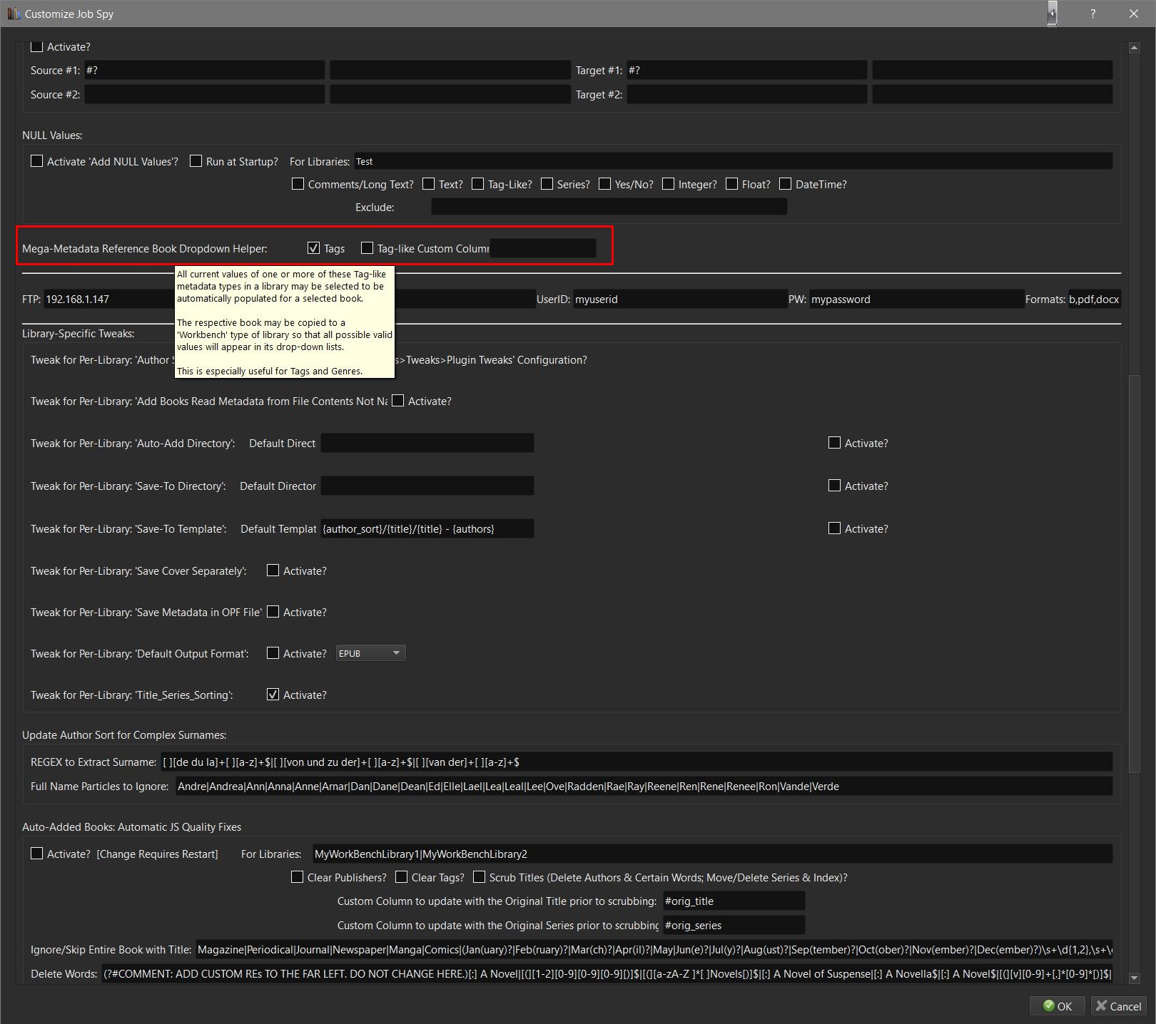 The JS configuration setting should be: Then, with the 'Empty Book" current, press (click/select return whatever) the "Mega Metadat...." option: Hey presto the book will have all the tags: BR |