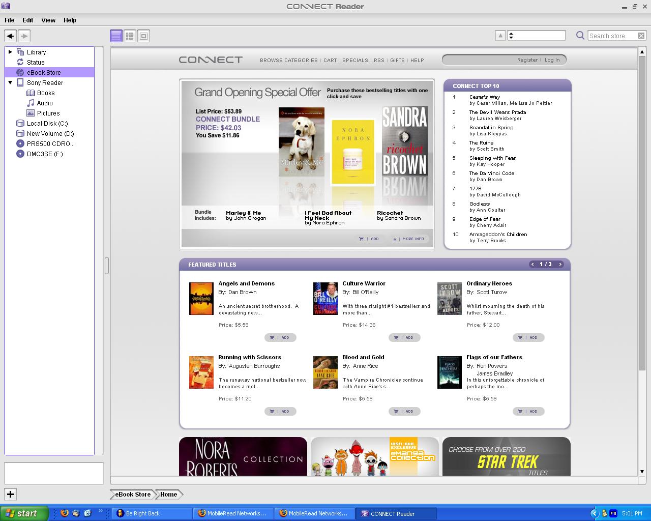 A thickness comparison. I did a side by side with a 400 page paperback. See how much space you save? ![]() The screen that greets you after the boot up. Pretty basic. A scan of one of my Star Wars novels. This is in rtf format which the Reader seems to really love (as well as txt). I tried a pdf but the text came out tiny. I'll play around with that. One more comparison shot. This time with a hardcover novel. I'm so glad I don't have to carry those around anymore. The last pic is a snapshot of the Connect software. I was browsing the eStore at the time. I would buy a book and document how that went but there was nothing that interested me that I did not already own. My apologies. One thing I cannot figure out is how to go back to the main menu after I load up a book. I tried every button. Very odd. I hope Natch or Bob knows what I mean. Anyway that's all I got for now! -C |