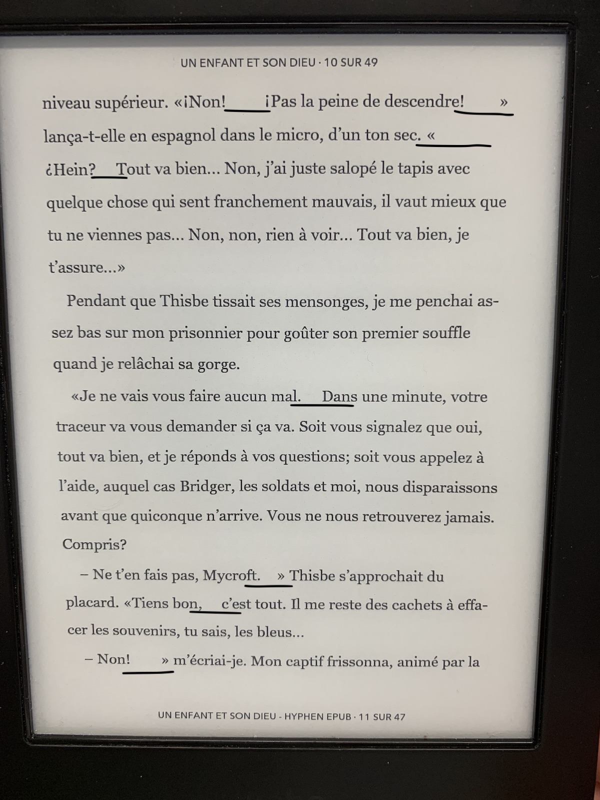 <p>– Ah oui, je… » Les paroles prononcées de l’autre côté de la porte parvenaient au visiteur mutilées, à demi étouffées. « J’ai appelé pour annuler. Nous avons une… un… problème… ennui… de sécurité.</p> I know that there are issues in the kepub parser for some characters. For example, spacing is added around an emdash when it probably shouldn't be. And isn't in an epub rendered using the RMSDK. I think there are similar issues with other characters such as the thin space used used. But, I don't normally see these as they are uncommon in English text. From what I can see, the extra long spacing is where there is a line-break and then leading spaces within the paragraphs and a thin space or endash on the previous line. This appears to be a bug in the parser. It might be language specific handling that is wrong. But, removing the line breaks and the leading spaces in the text improves the rendering a lot. Note: When doing this, I didn't do anything to add the spans into the file. I took the supplied sample and added it directly to the device. And edited another copy to wrap the text within paragraphs. Adding the spans would make a difference to this. It might be a case were wrapping the paragraph rather than a sentence within works better. Looking at a sample from Kobo to see what they do might be a good idea. |