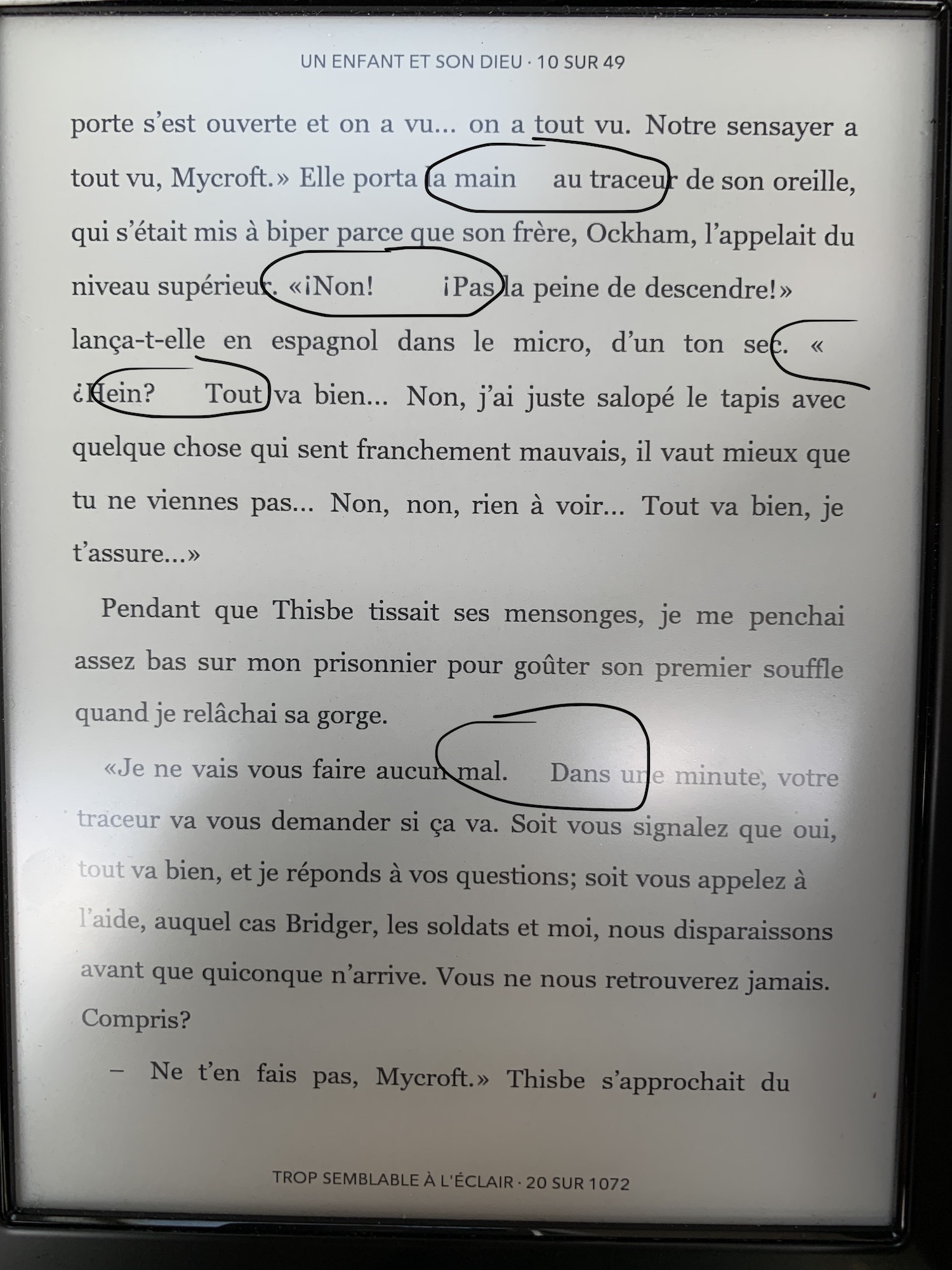 <p>– Ah oui, je… » Les paroles prononcées de l’autre côté de la porte parvenaient au visiteur mutilées, à demi étouffées. « J’ai appelé pour annuler. Nous avons une… un… problème… ennui… de sécurité.</p> I know that there are issues in the kepub parser for some characters. For example, spacing is added around an emdash when it probably shouldn't be. And isn't in an epub rendered using the RMSDK. I think there are similar issues with other characters such as the thin space used used. But, I don't normally see these as they are uncommon in English text. From what I can see, the extra long spacing is where there is a line-break and then leading spaces within the paragraphs and a thin space or endash on the previous line. This appears to be a bug in the parser. It might be language specific handling that is wrong. But, removing the line breaks and the leading spaces in the text improves the rendering a lot. Note: When doing this, I didn't do anything to add the spans into the file. I took the supplied sample and added it directly to the device. And edited another copy to wrap the text within paragraphs. Adding the spans would make a difference to this. It might be a case were wrapping the paragraph rather than a sentence within works better. Looking at a sample from Kobo to see what they do might be a good idea. |