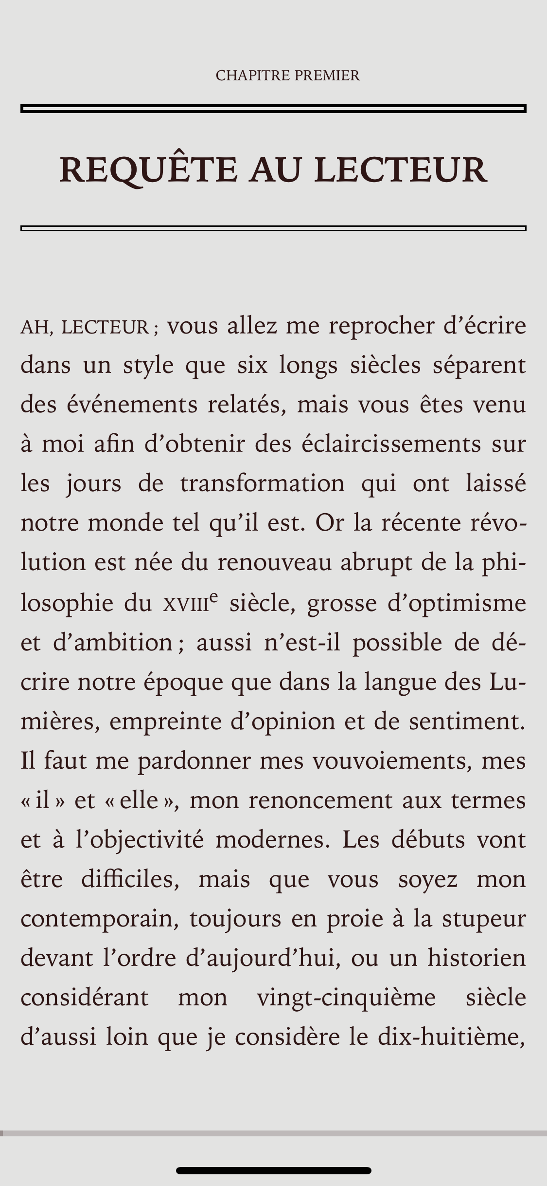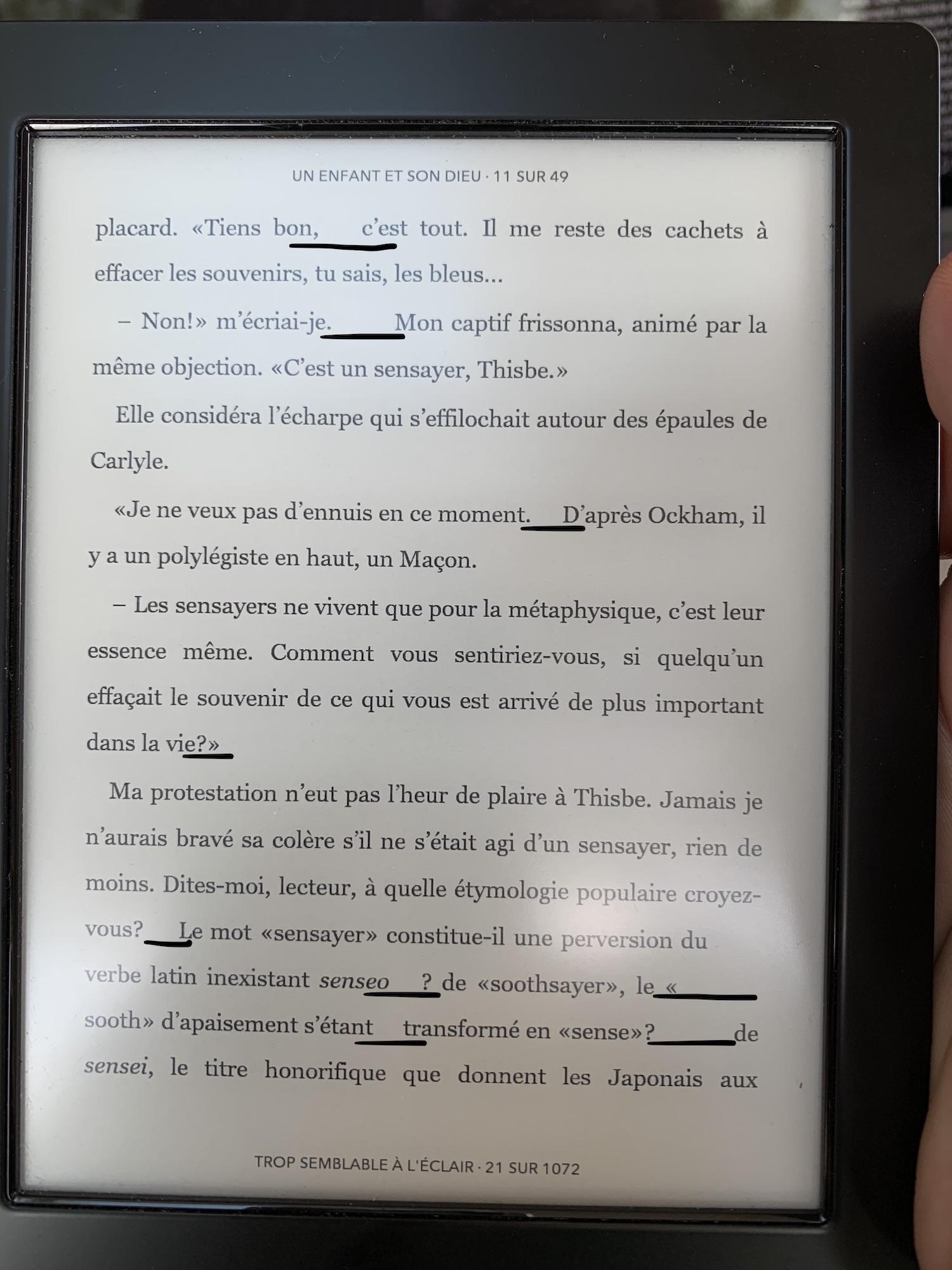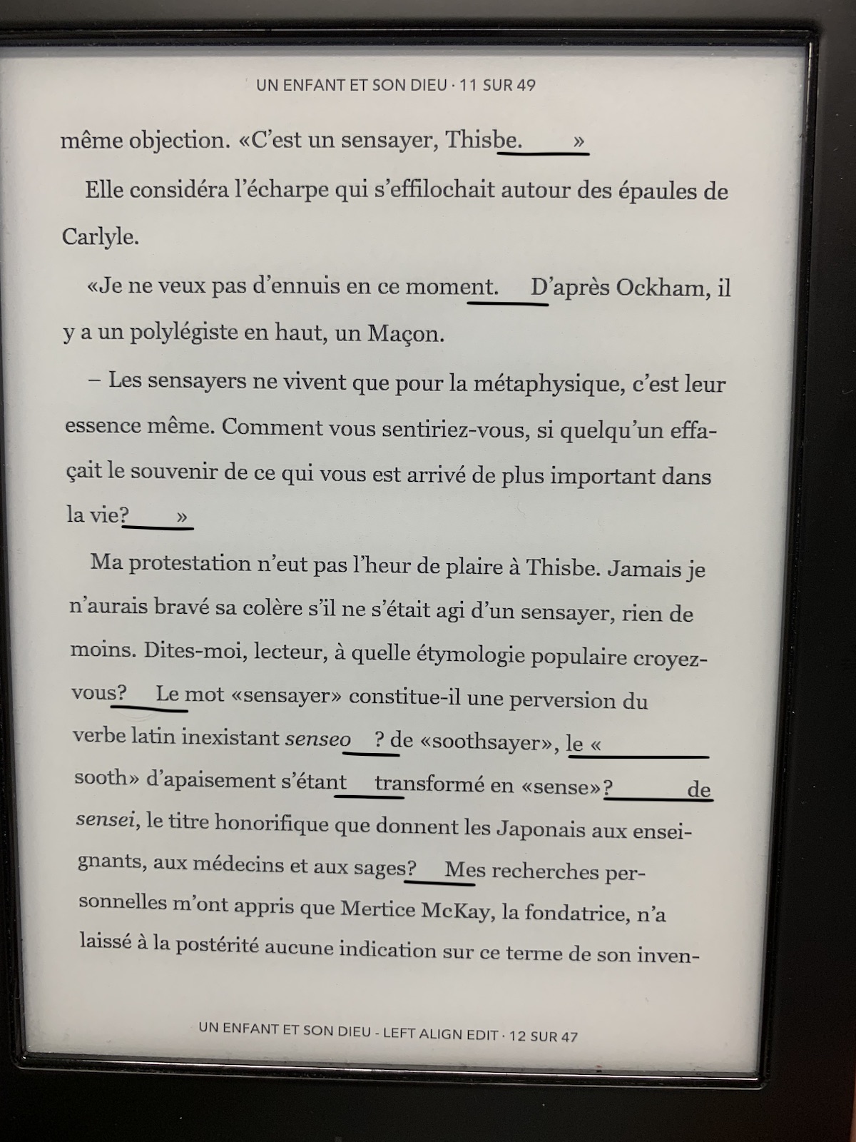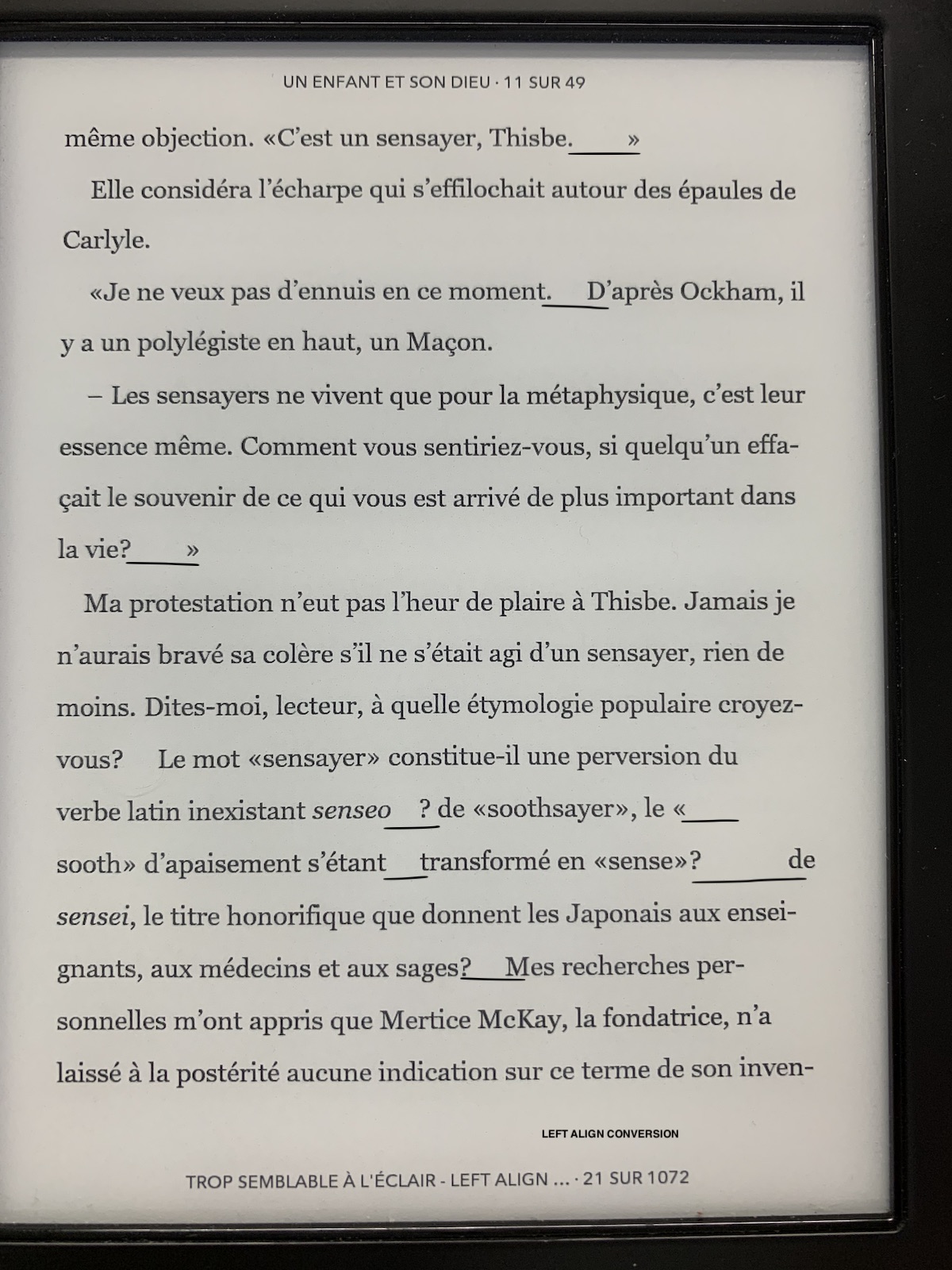 <p>– Ah oui, je… » Les paroles prononcées de l’autre côté de la porte parvenaient au visiteur mutilées, à demi étouffées. « J’ai appelé pour annuler. Nous avons une… un… problème… ennui… de sécurité.</p> I know that there are issues in the kepub parser for some characters. For example, spacing is added around an emdash when it probably shouldn't be. And isn't in an epub rendered using the RMSDK. I think there are similar issues with other characters such as the thin space used used. But, I don't normally see these as they are uncommon in English text. From what I can see, the extra long spacing is where there is a line-break and then leading spaces within the paragraphs and a thin space or endash on the previous line. This appears to be a bug in the parser. It might be language specific handling that is wrong. But, removing the line breaks and the leading spaces in the text improves the rendering a lot. Note: When doing this, I didn't do anything to add the spans into the file. I took the supplied sample and added it directly to the device. And edited another copy to wrap the text within paragraphs. Adding the spans would make a difference to this. It might be a case were wrapping the paragraph rather than a sentence within works better. Looking at a sample from Kobo to see what they do might be a good idea. |