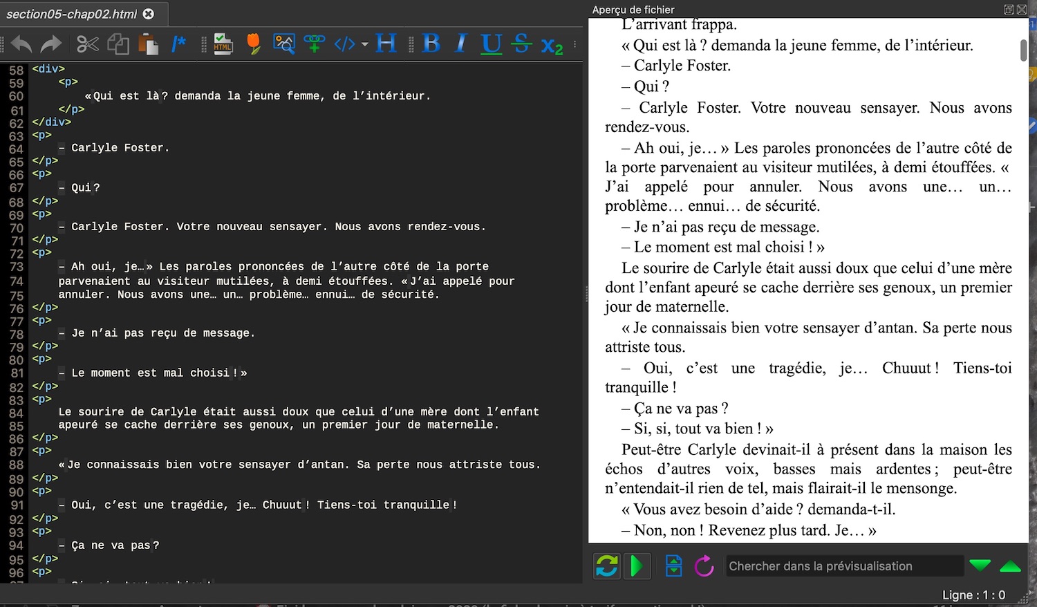 Thank you very much for your answers! I tried a lot of things with justify, and it doesn't seem to work. I noticed these thin spaces before and after some signs (like ! ? ; " ) and I was wondering if it was part of the issue, but as I am not used to epub code, I was not sure. So I will try to search and replace, so hopefully I can get rid of the thin spaces. How could I proceed to manage leading spaces in paragraphs? I will keep you posted with my results. Thanks again for your help. |