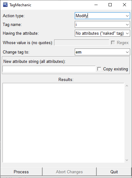 <p>This is an <em>italics</em>.</p> 1. In Sigil, highlight all the files you want to adjust. (Shift- or Ctrl-Click to highlight multiple files.) 2. In the menus, select Plugins > Edit > TagMechanic. 3. Set your settings just like this image: Action Type: Modify Tag name: i Having the attribute: No attributes ("naked" tag) Change tag to: em 4. Press the "Process" button, and this will flip all your <i> to <em>. Just like others are asking, I would be interested in many more details too. Last edited by Tex2002ans; 04-28-2020 at 11:57 AM. |