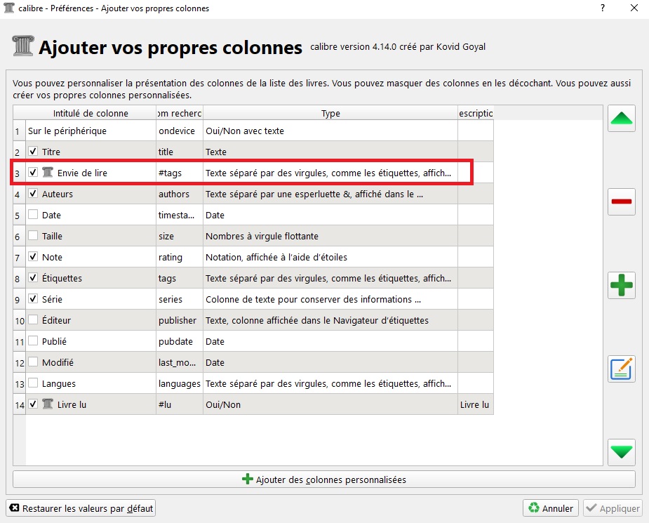 Today, I want only to copy collections from Calibre to Kobo and I follow the post what you gave me : https://wiki.mobileread.com/wiki/Kob...nd_Collections (Finally, I think so...) but I can't find my column "Envie de lire" into my Kobo. Can you please see my attachment to check if what I did is correct. I click OK after to fill it and Calibre was rebooted (Sorry but my Calibre is in french...). Thanks a lot to continue to help me. Jean Marc |