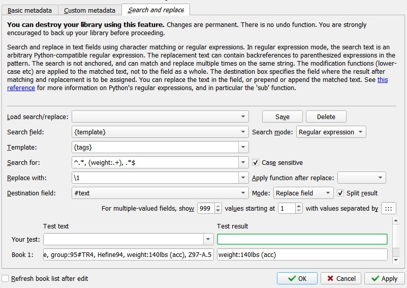 \,\s(weight:.+?)\,* Replace: \1 Destination field : <your other column> <<<this is important or you will lose the rest of the tags Search for a comma Space Capture weight an up, but not including a comma (optional) The cleanup is a whole lot trickier AND SERIOUSLY NOT TESTED Make a Backup, there is no Undo I would do as 2 steps First is where Weigh is the last item (this should just truncate it away) (.+)\,\sweight:.+? Replace:\1 Second is similar, but carves out weight and puts the 2 chunks together with a comma space (.+)\,\sweight:.+?\,\s(.+) Replace:\1, \2 |