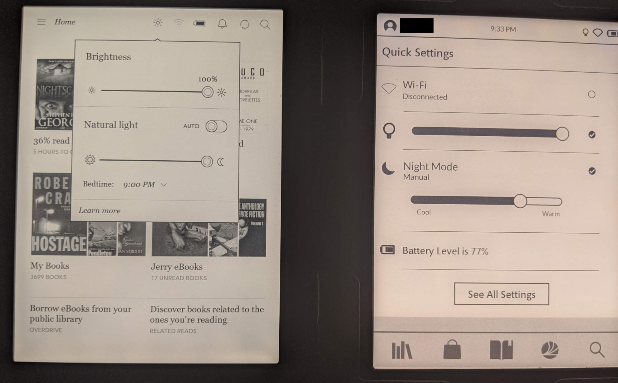 On the Nook, when using warm light settings, from 0% to about 75% the white lights are on and more and more orange is mixed in. But, once you cross about 75% warm lighting, the white LEDs fade off and then only orange LEDs are lit. A picture is worth a thousand words, so I've attached two thousand words for you. The Clara is on the left and the Glowlight 3 is on the right. Lighting is different device to device, but in one I tried to get the two as equal as I could. On the other I maxed out the Nook's warm lighting. The difference is obvious. (Sorry for the slight fisheye. My Pixel is being weird). Edit: after reading for the night, I tilted my Clara until I could see the glow from the LEDs at the bottom. At max orange, the white lights are off. So I'm not sure why the Nook has so much more range. The white lights do only seen to turn completely off when you are at our near 100% night mode though. Last edited by ZodWallop; 06-27-2020 at 01:36 AM. |