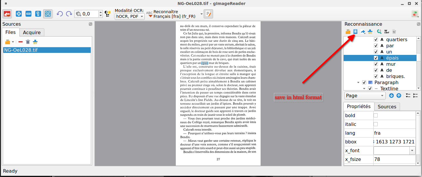 ![]() See screenshot I process only .tif images coming from Scan Tailor. I recognize text in HOCR format by blocks of 70 pages max I save in html file (see red arrow) I insert the block file in LibreOffice and save as odt. Each block has a 3 mega size max I suppress all bookmarks and sections, block by block. the result is a clean enough odt file that will be later converted using ODTImport (a Sigil plugin). Last edited by roger64; 07-13-2020 at 05:47 AM. Reason: image |