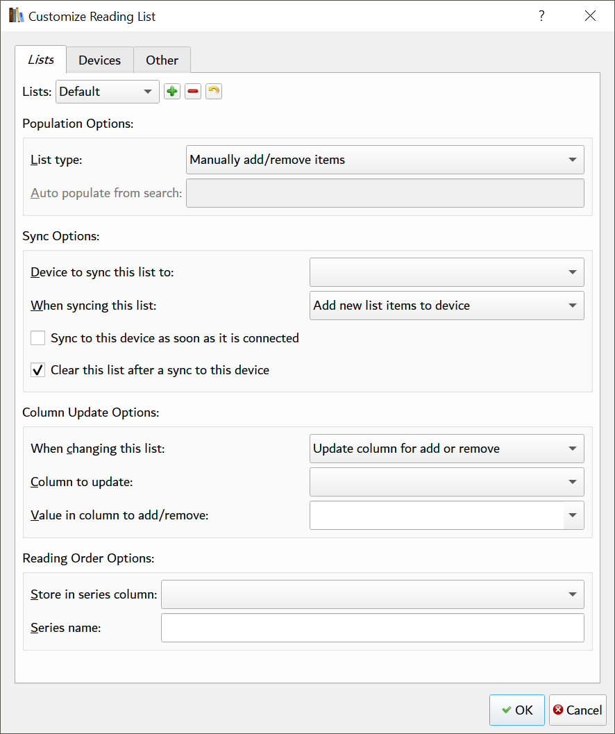 For the record, I use the "Add/overwrite all list items on the device" with the "Clear this list after a sync to the device". Then I have one list per device. Any new or changed books get added to the list for the device I want the book on. When the device is connected, the books are sent and the list is cleared. I don't keep a list of what is on the device. Because this method means the list would be "the books that are supposed to be on the device" plus what is in the reading list. And it doesn't harm if I add a book already on the device to the reading list. |