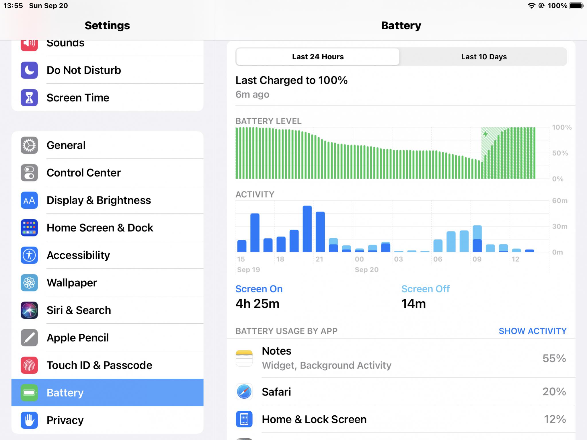 Sudden battery drain issue on iPad mini 5 after creating a stacked widget: Battery life under iOS 14 and iPadOS 14 had been okay until last evening. It still seems okay on my iPhone XR, but it went south fast after I added a stacked widget to my iPad mini 5. The stacked widget has The Weather Channel, News, Calendar, and Podcasts wizards in the stack and is NOT set to rotate by some weird Apple scheme. I turned the mini screen off overnight and the battery dropped 32%! WTBleep! I checked the Battery settings and it shows that the Notes app was the main culprit, but that makes no sense at all. Notes has no need to keep in contact with the iCloud at all times. It should be able to phone home after it is opened to see if any changes to any notes have been made on other devices. The listing for Notes showed the words widget underneath it, but I don’t have Notes in a widget. Maybe the Battery app is wonky and flagged Notes rather than the stacked widget. I can see News and WX both wanting to constantly phone home, and perhaps Podcasts too, but not Notes. I'm charging the mini now and will verify later, but prior to updating to iPadOS 14 and iOS 14 I had the Do Not Disturb settings scheduled for 23:00 to 07:00 on all my devices. The iPhone XR shows that to still be the case. I'll check the mini when I get back home. And one more thing, to channel the ghost of Jobs, the first thing I checked this morning was whether the mini had been downloading updated apps over night. It hadn't, and manually checking showed no new app updates available. So that wasn't the culprit. Notes being the culprit still bothers me. I spend way more time on Safari than all the other apps combined, yet the Battery setting usage graph showed Notes being used way more than any other app. That is a big ? IMO! ETA: I’m back where I can look at my iPad mini again. I attached a screen capture showing the Battery settings and another showing the stacked widget I placed on my Home screen. The Battery graph shows 56% of usage is tied to the Notes, app and in small text below that states, “Widget, Background Activity.” So it looks like Apple has a battery issue with widgets on the Home screen in iPadOS 14. My iPhone XR only has the 2x2 Clock widget on its Home screen, and it doesn’t seem to have this battery issue. Bu I don’t have the four widget stacked widget on my iPhone XR. Last edited by OtinG; 09-20-2020 at 03:04 PM. |