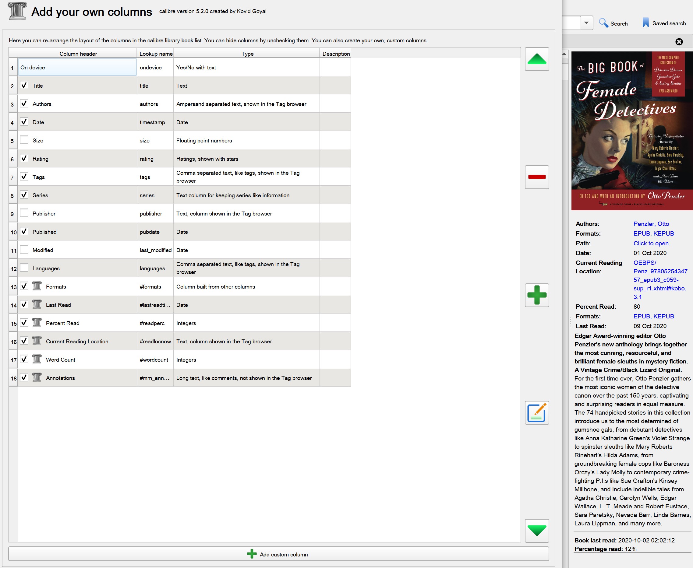 I chose the word "oddity" with care - this quirk does not trouble me, it intrigues me. I have never noticed a reading status update underneath a book's metadata info as in the screenshot before, and have made no changes to the Calibre setup to account for it. I have no idea how it even got to 12%, nor why it has not moved at all since that time, nearly a week ago. It's a mystery, which is kind of apt given that the book is a mystery anthology.