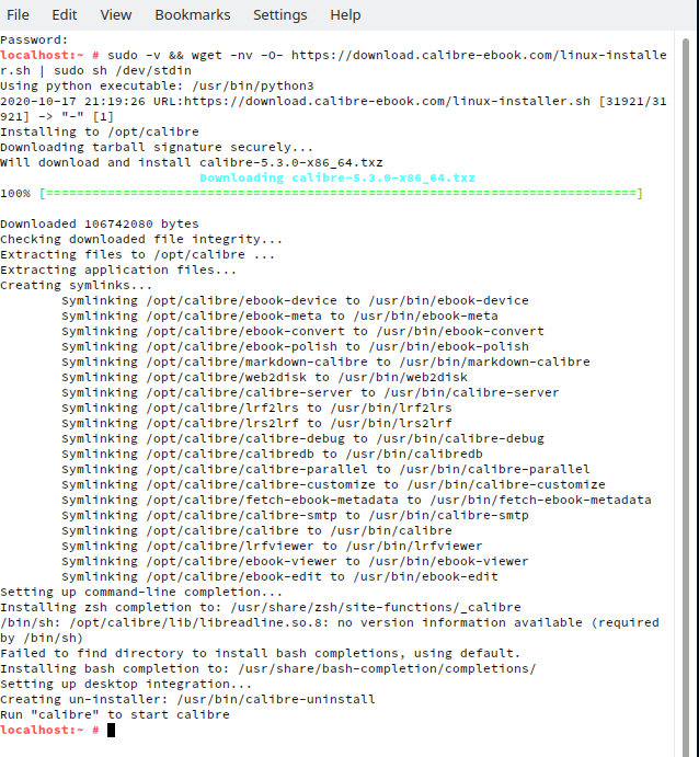 One question that comes to mind is if this is a version supplied by a Linux distribution or did you install it from Kovid's site ( https://calibre-ebook.com/download_linux )? Running the installer from Kovid's site should give output similar to the attached image. Last edited by DNSB; 10-18-2020 at 01:22 AM. Reason: added image for calibre Linux install using Kovid's site |