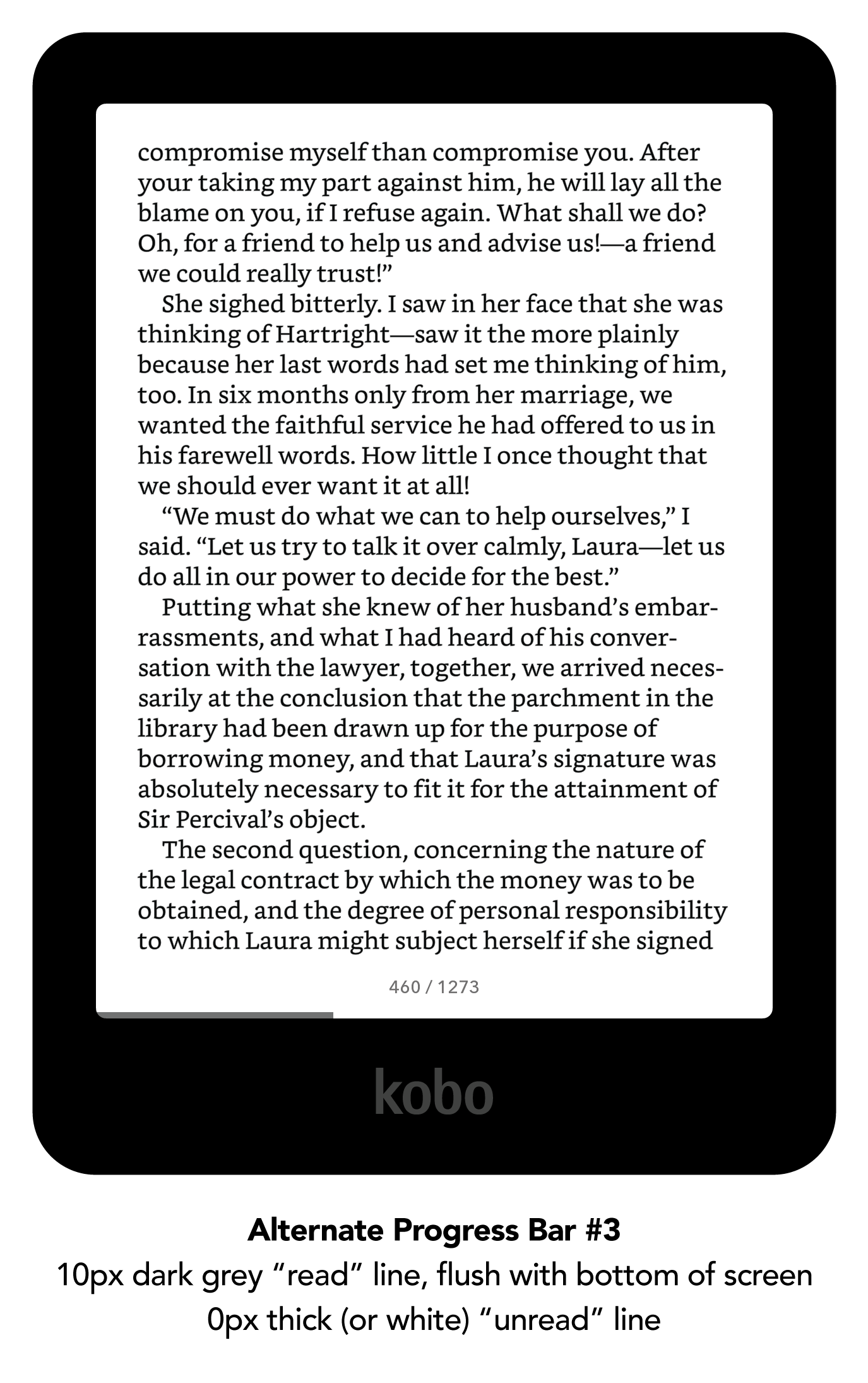 Adjusting these things could really refine the look of the progress bar, making it appear more sleek and less "clunky" (to my eyes). I have attached screenshots of various mockups to fit my Clara screen, and I when I view them on my device, I feel these would be amazing upgrades to the look of the progress bar.