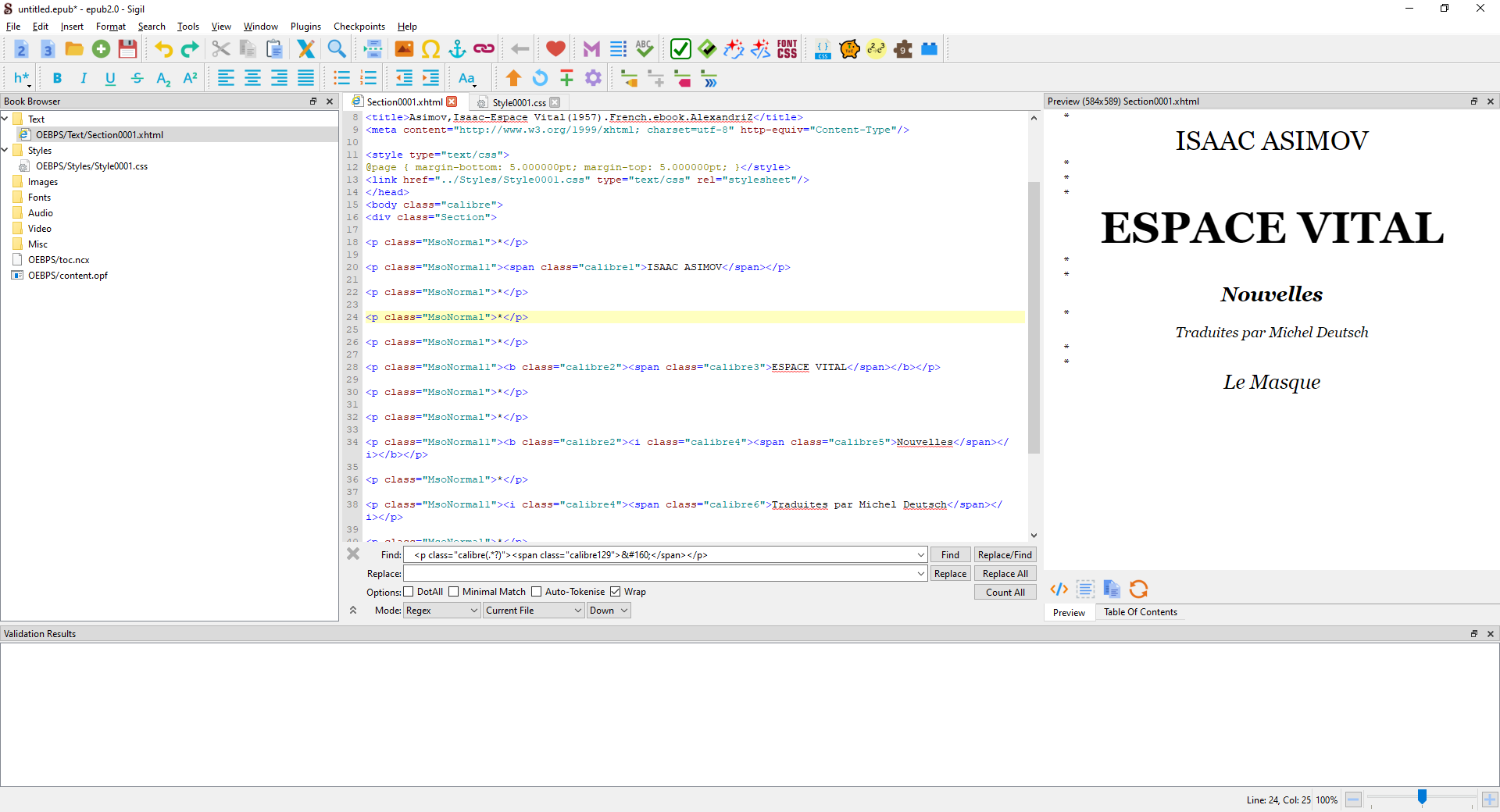I use Sigil for many years and the last version I use is 0.9.14. I dis not like the new versions after this one, so I stayed on 0.9. But now I wanted to try the last version 1.3 and got a very strange behavior. The text and images on the right pane are shown like in a mirror (inversed), while in the left pane, the text is normal. I edit books in french language. I tried the 1.3 and 1.2 on 2 virtuals machines in Virtualbox, Windows 10 V 2010 and Windows 8.1, all up to date. I join a capture here. |