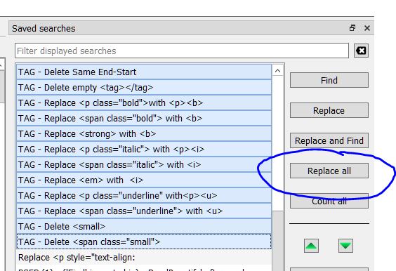 This is of course repetitive. Is there a way to batch-process a number of search and replace commands all at once instead of having to type them in? I wouldn't be surprised if that has been included, I just haven't found it. These are just a few of a long list that I use with every book I edit. REPLACE <body [^>]*> WITH <body class="calibre"> REPLACE WITH NOTHING id="[^\"]*" <a [^>]*> REPLACE this with that <b [^>]*> <b> <i [^>]*> <i> <em [^>]*> <em> ETC. ETC. Thank you for your time. |