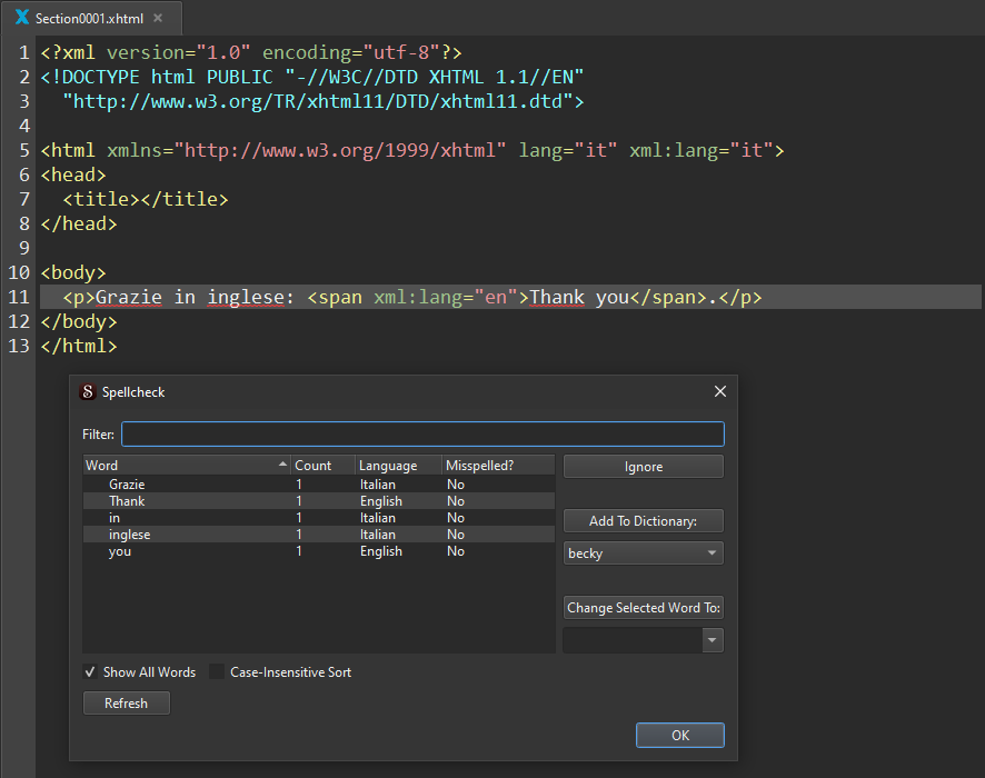 I'm sorry, I said an inaccuracy earlier. EPUB3 has nothing to do with the problem. The problem was that the metadata language (dc: language) – in my epub3 – was "it-IT" (and not just "it"). But I only have an "it" dictionary, so the Spellcheck Box didn't show me ANY words. So this "error" depended only on me and on the dictionaries installed. Now I have added an "it-IT" dictionary and everything works perfectly. Then the problem is only one – at least as far as I can verify: if the metadata language (dc: language) of the epub and the "Defaul Language For Metadata" in Sigil do not coincide perfectly, the jump from the Spellcheck Box to the word in the text (Code View) does not work. But I have a further question: does the Spellcheck Box have anything to do with the secondary dictionary? (In this case, what's the point of putting the language next to each word in the Box?) |