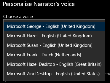 When I open the Read-out-Aloud setting in the viewer I miss the existing options George, Suzan and Frank. There seems to be an additional new voice named Zira however. (Suzan under another name?) No matter which option I select in the viewer, I always seem to have selected Hazel (according to my limited audio recognition capabilities). Do I miss some config settings to make the voice selection work? |
