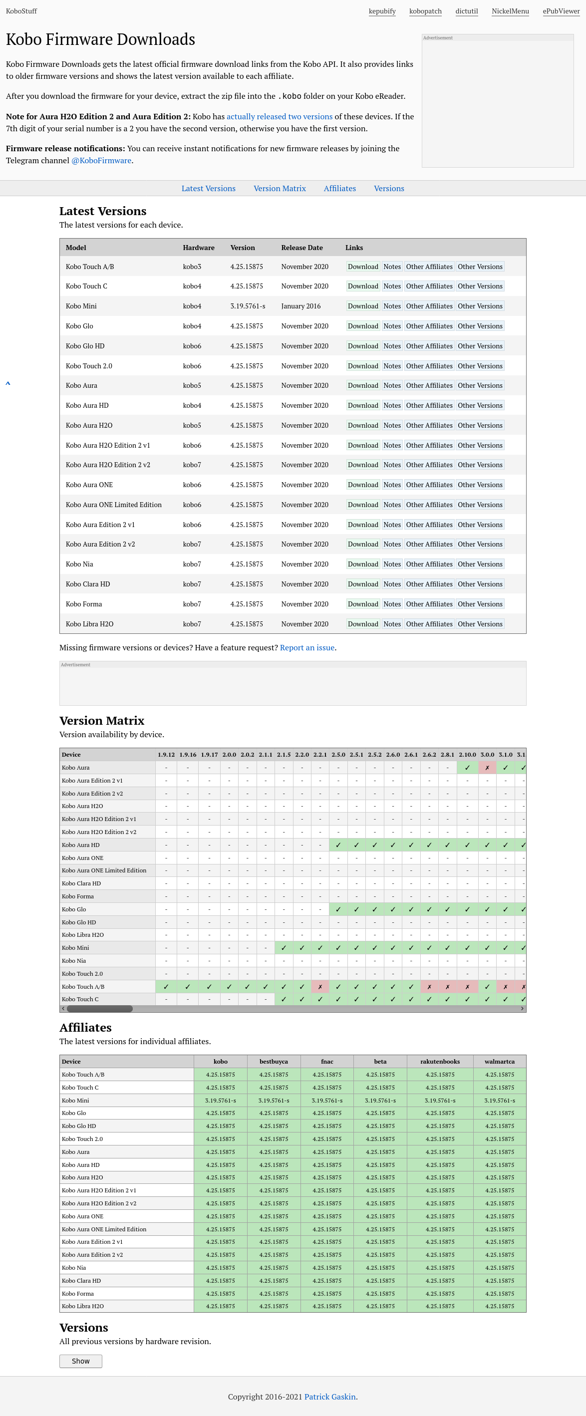 I've finally gotten around to finishing the redesign I've been working on for my Kobo firmware page for a while. It's now cleaner, more compact, and the tables are easier to read. In addition, there's now a dark mode for devices which support it. There's also now a second navbar to quickly jump between sections. Otherwise, the functionality is identical, but I plan on making some performance improvements later to make the page load faster.