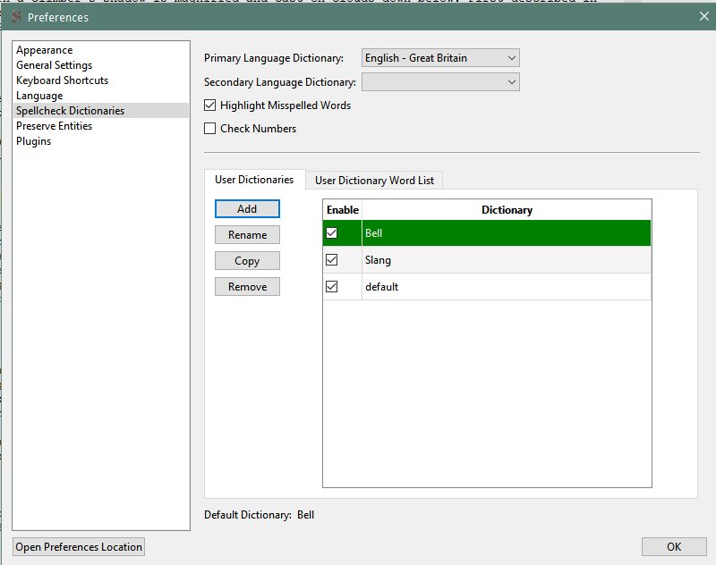 1. Is all of this being done from the spellcheck dialog itself or from a menu? - from the menu that pops-up when you right-click a word. 2. Are the words all in one language or many? - English only. 3. Do you have multiple dictionaries set (ie both Primary and Secondary dictionaries or only primary) - Primary only (English - Great Britain) 4. Are you changing from default to a new wordlist in the Sigil Preferences or someplace else? - Not sure what you mean. I don't think I am changing from default just adding a new wordlist specific to the book I am working on. (img) 5. How exactly are you telling it which wordlist to use, in the SpellCheck dialog itself? - I am not using the spellcheck dialog, this is when working in code-view and right-clicking on an underlined word. When right-clicking on an underlined (misspelled) word you have the following options: 1 - Add To Default Dictionary 2 - Add to Dictionary > (which lists the dictionaries available( img)) If I select option 1 the word does NOT get added to default, but to (as in this case) Bell. Surely if the options 1 and 2 were correct the word should have been added to default NOT Bell. If I remove 'Bell' any words that I then add to default using option 1 are saved correctly. The 'slang' dictionary I added does not seem to have any effect on the operation of saving to default. Hope that makes it a bit clearer. https://www.mobileread.com/forums/at...1&d=1611847769 |