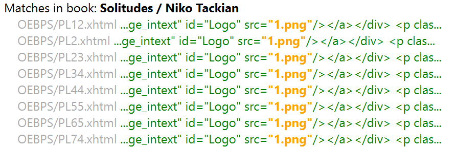 Also, are you sure you are really finding 1.png instead of ePub with files such as twitter-01.png. Using the quality check plugin, it will find matches that are not matches. What would help is if an exact match option in the search could be added to Quality Check. Last edited by JSWolf; 02-18-2021 at 09:18 AM. |