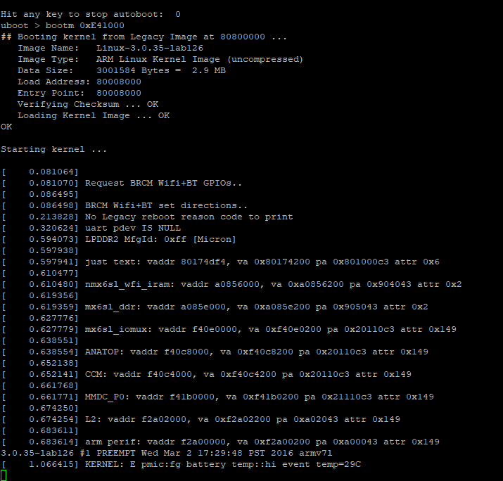 bootm 0xE41000 If you can't enter uboot check your tty settings (esp. flow contral and local echo and such).. Good luck |