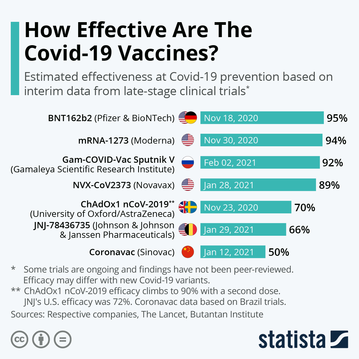 The headline statistics are for mild illness because the confidence intervals are much narrower than for the rarer, serious, cases that we care about the most. The hospitalization confidence intervals for the allegedly posher jabs (Pfizer/Moderna), and the others, overlap. Pfizer/Moderna first/second dose intervals, in the U.S., are too short by standards of other vaccines. The only reason the phase 3 testing was done with such short intervals - and it was an excellent reason - was the need to complete the studies before millions more died. But I will take my second shot on the day scheduled. All in all — there is a great deal to be said for taking what you are given. Don’t assume that which of these is best is settled science. And all protect against the great majority of deaths. P.S. I hope saying something isn’t settled science doesn’t sound alarming. Medical care is getting much better over time, even though much of what physicians and surgeons do, at any point in time, turns out not to have been the best. I suspect a lot of people don’t like that reality, which is why there is so much unfair criticism when medical advice improves AKA changes. Last edited by SteveEisenberg; 03-03-2021 at 09:54 AM. |