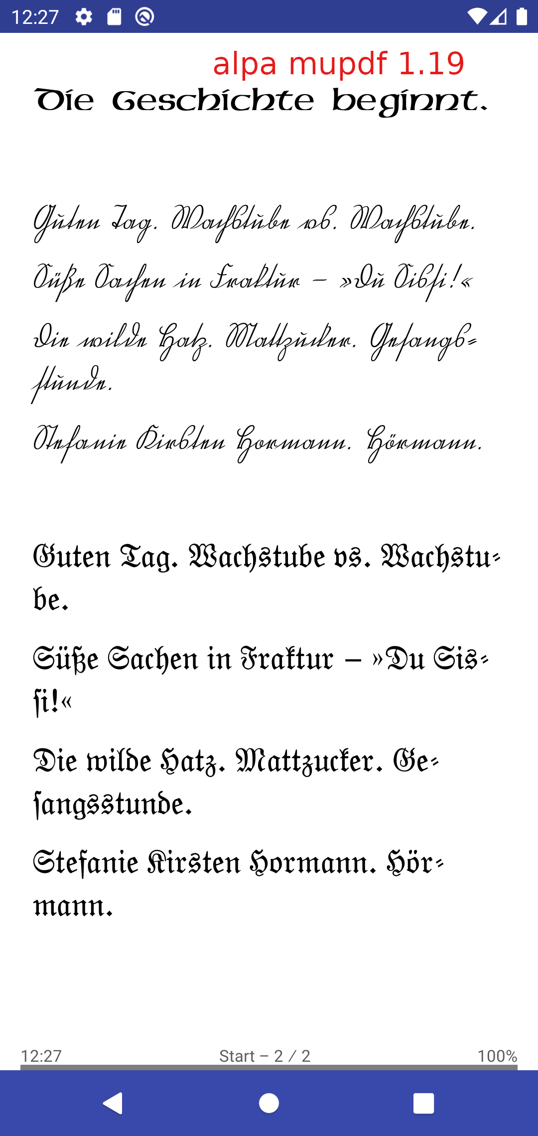 I am working on some EPUBs that use old German Kurrent and Fraktur fonts (fully embedded as .ttf but with rather complicated OTF rule sets). These display correctly with Calibre (see screenshot) but not on my smartphone using Librera. Could you have a look, please? The first screenshot shows what’s expected—two "end-s" situations are marked, but there is more, like correct ligature building for "ſt", "tz" and so forth. Second screenshot shows how it’s displayed on my smartphone (using the default "Times" setting). I also include a test EPUB file, for verification. |