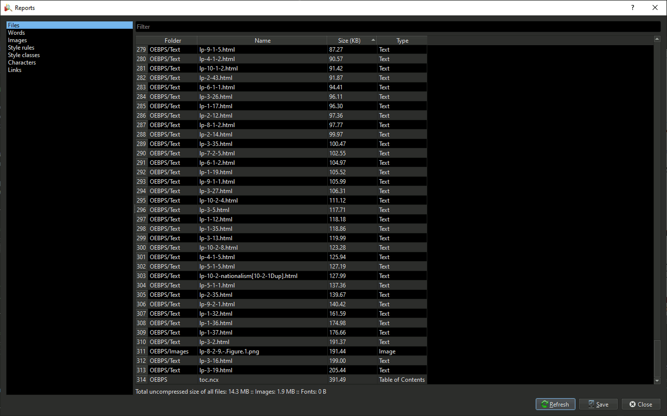 Calibre Dialogs With Alignment Issues I believe these dialogs could use a touchup: Tools > Check Spelling (Alt+F7) - Count -> Right - Language -> Left * * * Tools > Reports Files - Size (KB) -> Right Words - Times used -> Right Images - Size (KB) -> Right - Times used -> Right Characters - Times used -> Right |