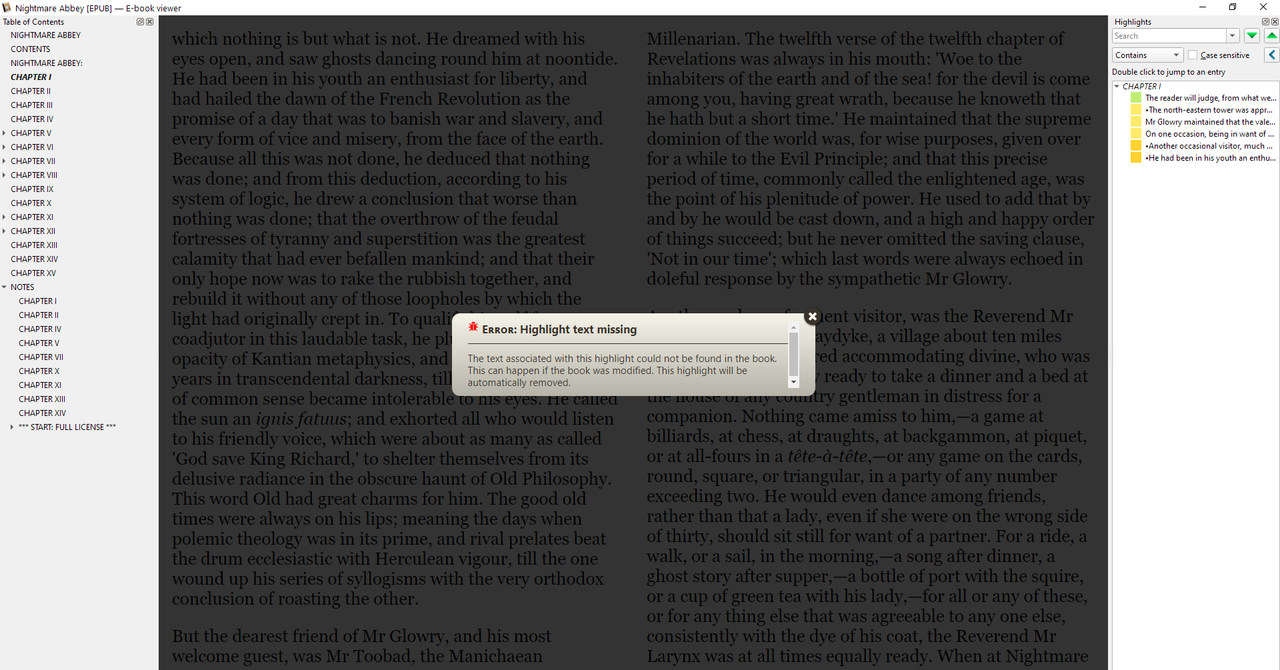 This often happens after I try to add an annotation to an existing highlight. Causes a whole bunch of things to just be lost forever. Sometimes it seems to happen connected to nothing at all, and I'll open a file back up to find all the highlights and annotations gone. Fortunately I exported to markdown before this last one happened. edit: better image host Moderator Notice