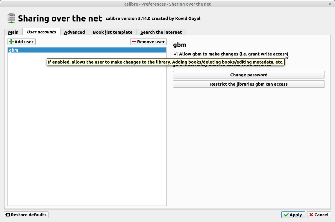 However, I was also able to delete a book from my library with the delete button in the browser interface! Yikes. I have created some family history E-books, and was going to share those books to extended family through Calibre Server... so I would want to remove that button. How can I modify that browser interface? or set up a read-only user account? Alternatively, I will just E-mail the books when requested. |