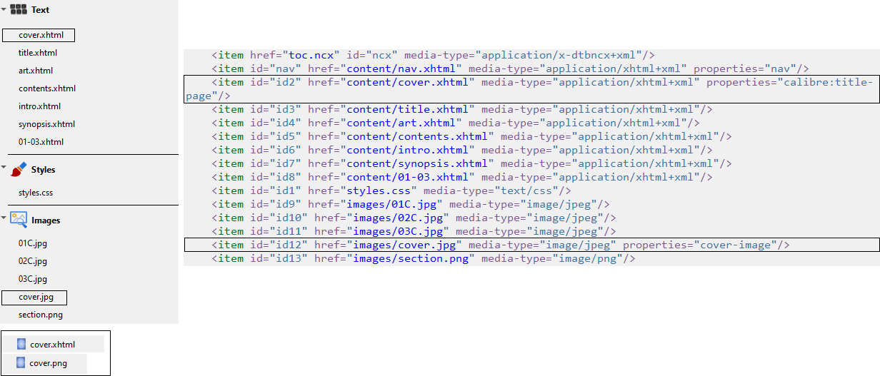 In the left pane, showing the file list, in one of my projects it is not showing the blue cover icon after I have set the cover page and cover image. As shown in the code, the page and image are set as the covers, yet no blue cover icon shows. However, in another project, they are shown (as seen in the lower left corner). They both have the same code to set the covers. Is there a fix to make the icon show? |
