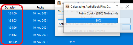 This plugin calculates the duration of the audiobooks or audio files associated with a book (within its folder), and adds that duration in a custom column that we have previously created for this purpose. (It will be a duration column but we can call it whatever we want). At the moment it has no additional functions. Main features Calculate the duration of the books in our library, or of the associated audios that are included in the folders of the selected books. Put that result in a custom column, previously. Special notes Requires calibre 5.xx (python3)(QT5) It needs python3 Compatible with calibre 6.xx (QT6) suported operating systems: -Linux (Pluguin is working) Tested on ubuntu 20.04 -Windows (Plugin is working) Tested on windows 10 Maybe fail if calibre plugin folder doesn't have permisión for all users, i tryied to solve this and i think its solved. -Mac (Plugin is working) Tested on MacOS Big Sur 11.6 Supported languages (This plugin has support for translations): You are free to provide a translation in your preferred language Spoiler: