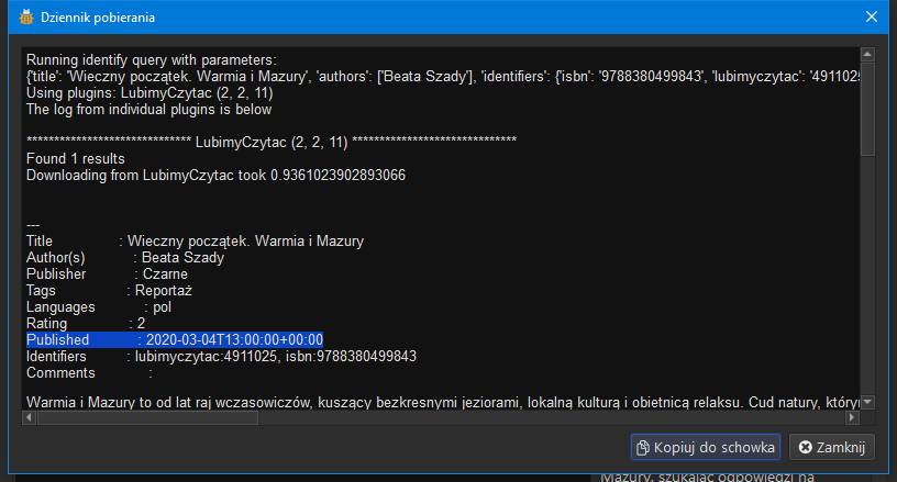 chciałem zgłosić mały błąd we wtyczce polegający na błędnym uzupełnianiu daty publikacji książki, ale dotyczy to tej daty z rubryki "Opublikowano" progamu Calibre, i co ciekawe: o ile rok wydania jest prawidło zapisany w w/w rubryce, to błąd dotoczy miesiąca wydania książki (i po najechaniu kursorem myszy także dnia) gdyż zawsze jest to styczeń roku w którym wydana została książka (np. sty 2019 lub np. sty 2021).