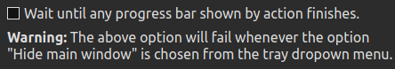 • For dialogs that do not block the main thread (e.g. progress bar dialogs, but other dialogs might do the same), but instead act from another thread, action chains will immediately proceed to the next action, even before the dialog finishes. This is almost always undesirable, hence, the option in Calibre Actions to wait for the dialog until it finishes. (see attachment).