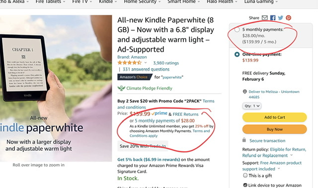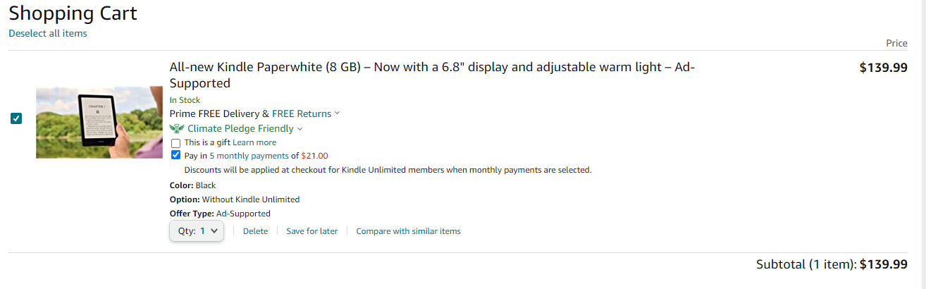 As a Kindle Unlimited member, you're qualified to receive 25% off an ad-supported Kindle Paperwhite when you purchase with monthly payments. The all-new Kindle Paperwhite features a 6.8” display and thinner borders, adjustable warm light, up to 10 weeks of battery life, and 20% faster page turns.