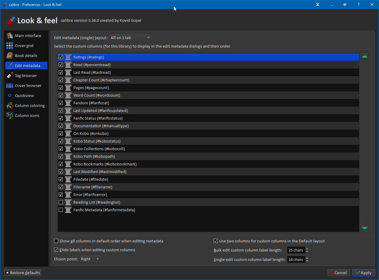 I moved the 5 edit metadata tweaks to the look & feel dialog. They are use 2 columns, elide custom labels, where the elision point is, and the label widths for bulk and single metadata edit. The changes are in source.