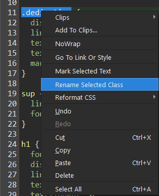 ETA: AHA! When I selected the name, I missed the dot, i.e., I double-clicked on the class name "ded", which did not include the dot ".ded". Once I selected name with dot, I got "Rename Selected Class". I knew I was doing something stupid, haha! ![]() Thank you BeckyEbook! Last edited by odamizu; 02-24-2022 at 03:34 AM. |
