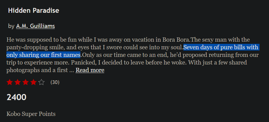 I'm glad Kobo isn't spending their valuable time/manpower correcting such silly misspellings. OTOH: There's always the chance that it ISN'T a misspelling. The man with the panty-dropping smile is a gigolo and therefore it will be seven days of bills. And secretly I wish that there was another misspelling. How fun would have been if it was a panty-dropping simile?