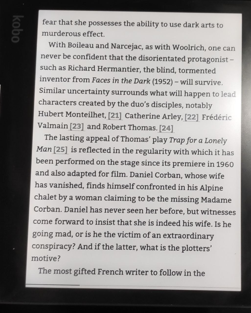 ![]() This has been a fun and interesting exercise in trying to figure out the mystery of the maths, but when it comes to the Kobo stats I know neither whodunnit nor how. As shown above, it's not a complex book in terms of layout, all text, and lots of it. It will be interesting to try a de-drmd epub version in KOReader to see how its measurement of progress stats compare. |