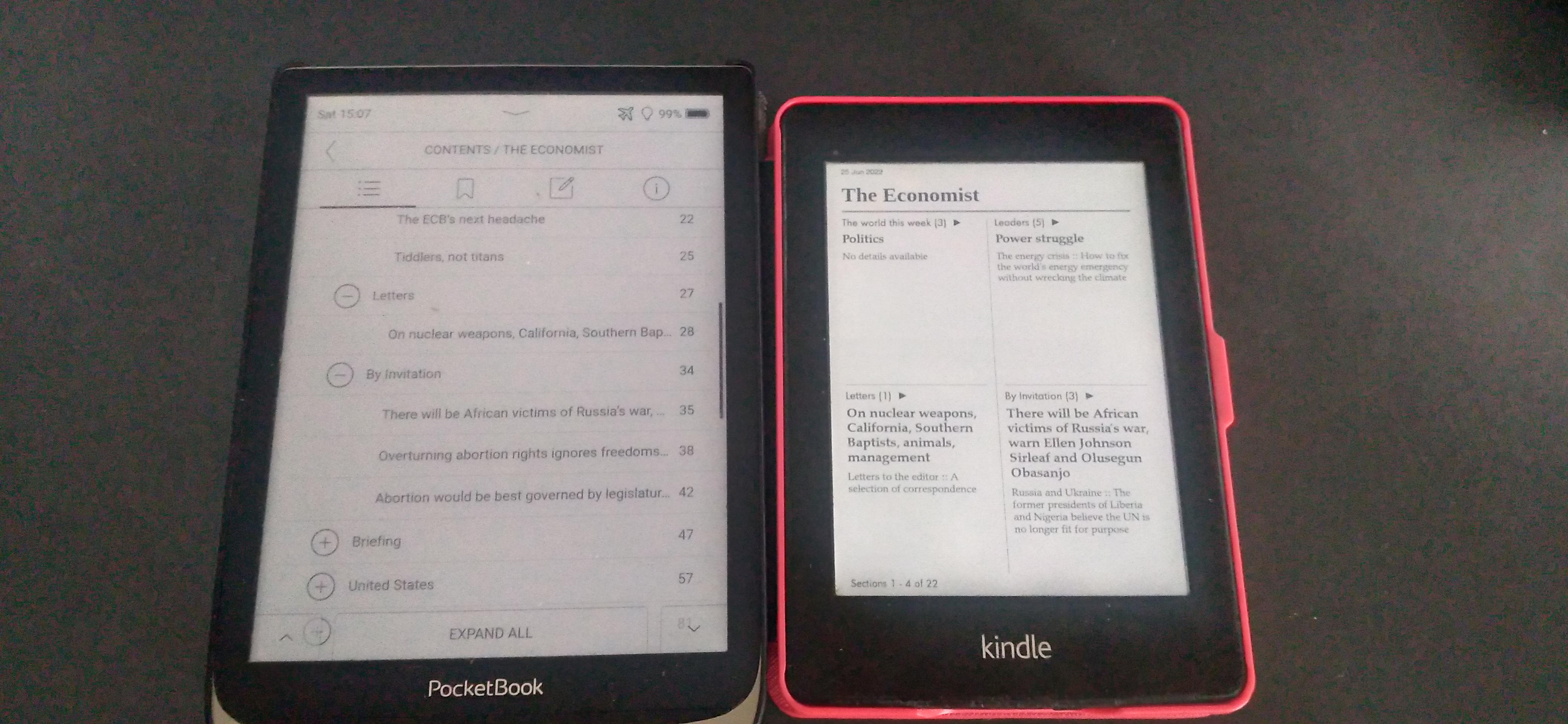 You mean these two views in the images attached? I do not see how they provide functionality that is so different from other readers, i.e. Pocketbook. It also allows you to browse the ToC of a periodical. I agree the Kindle's interface is a bit better designed but I do not see much difference in functionality apart from Kindle's function to skip to the next article. This function is present in the navbar but only at the beginning of an article.