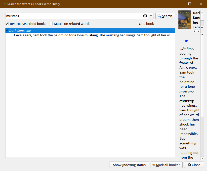 In my case, it only searched the one book I currently had selected. I had several other books visible in the list that had 'mustang' in the text, but only the selected one showed up.