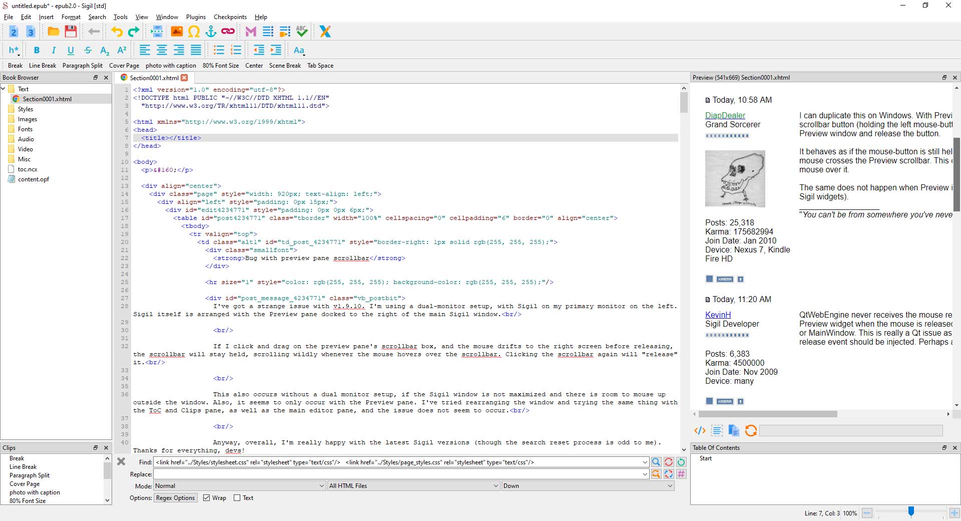If I click and drag on the preview pane's scrollbar box, and the mouse drifts to the right screen before releasing, the scrollbar will stay held, scrolling wildly whenever the mouse hovers over the scrollbar. Clicking the scrollbar again will "release" it. This also occurs without a dual monitor setup, if the Sigil window is not maximized and there is room to mouse up outside the window. Also, it seems to only occur with the Preview pane. I've tried rearranging the window and trying the same thing with the ToC and Clips pane, as well as the main editor pane, and the issue does not seem to occur. Anyway, overall, I'm really happy with the latest Sigil versions (though the search reset process is odd to me). Thanks for everything, devs! |