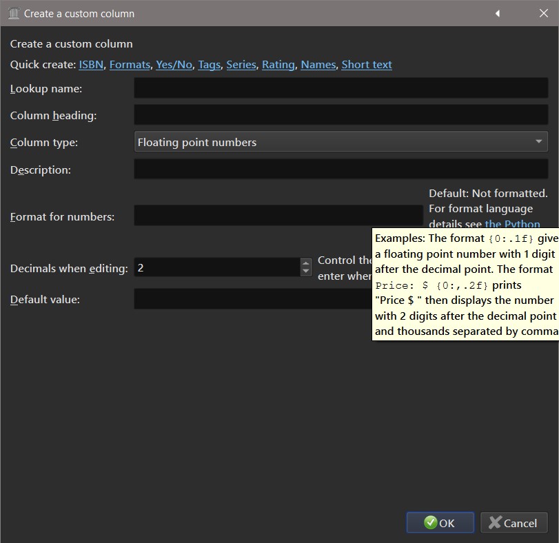 I would like it formatted with a dollar sign, 2 decimal places and right aligned. It won't be used for sorting or searching, I'd just like it to look nice. I'd be just as happy using a text-based column if someone can help with setting it up to be right aligned (if that's possible). Any help would be appreciated. Oh, and I'm using calibre 0.8.5 on vista. Thanks! |