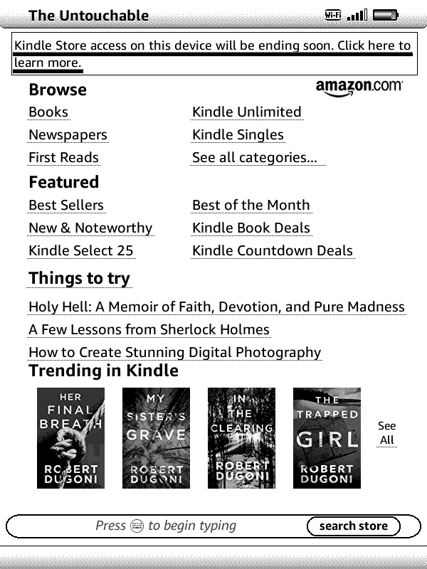Kindle 2 (International) Kindle DX (International) Kindle 3 (aka Kindle Keyboard) Kindle 4 (aka K4NT) After the servers shut down later today, you will still be able to download books, doing so via "View Archived Items" and having books delivered to one of these devices on Amazon's website. ![]() Look at https://www.amazon.com/OldKindleFAQ for more information. I also went through the extra effort of taking screenshots of the end of support messages, as seen on my Kindle 4 (Black), but they exceed the forum's image size rules. ![]() Edit: It has officially shut down now. Edit 2: I have added the screenshots as attachments. Last edited by Badcatalex; 08-17-2022 at 06:51 PM. Reason: IT SHUT DOWN AT 1:30 PM CENTRAL TIME OR SO |
