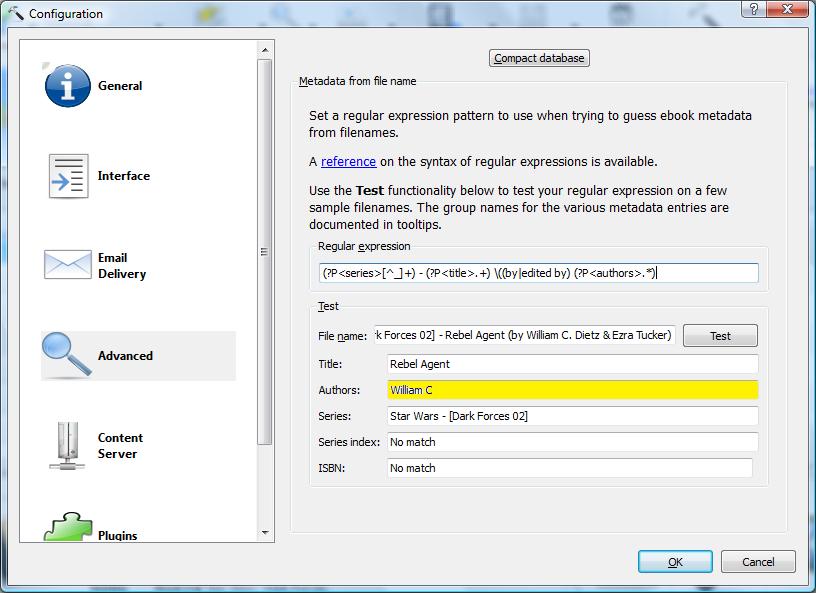 I've one last question. I've gone over the python manual link for matching expressions (I'm no coding genius) and find myself stuck. Several of my books have an initial in the name. For example: Kevin J. Anderson I've ALMOST got this to what it needs to be, processing: Star Wars - [Young Jedi Knights 01] - Heirs of the Force (by Kevin J. Anderson & Rebecca Moesta).pdf Currently processing to: Title: Darkest Knight Authors: Kevin J Series: Star Wars - [Young Jedi Knights 05] I'll be going in after to clean up the series because I'm entering in a bit more and it keeps it 'marked' in a way so I can differentiate between what I've finished editing, and what I still need to edit, so the Series is OK. However, as you can see, it's dropping everything in the author field after the . Current expression is set to: (?P<series>[^_]+) - ($P<title>.+) [(]*by*(?P<author>.+) How do I fix the author so it pulls the entire Author instead of cutting off after the .? Secondarily to that, I'm using *by* because some of them have "edited by" while others are just "by". Is there a way to set that up as an or, so it will look for "by" or "edited by"? |