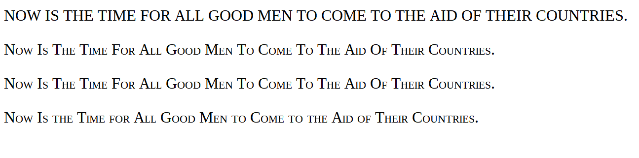 <p class="sc">NOW IS THE TIME FOR ALL GOOD MEN TO COME TO THE AID OF THEIR COUNTRIES.</p>