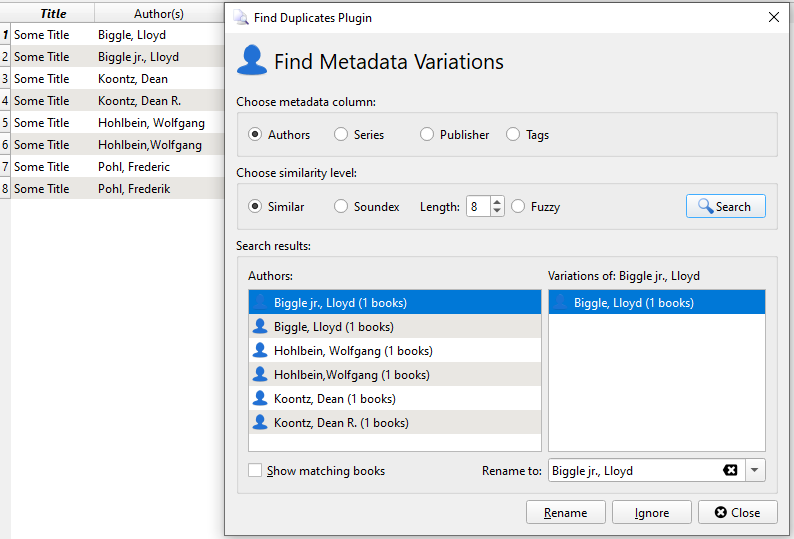 First of all: Thanks for this AddOn as it helped me a lot in the past. I am not sure if the problem is now the new Calibre-Version (working on Win10 for the first time with Calibre 6.6) or a reason of your Tool that it does not work as well anymore as it did in the past (with former calibre versions on former windows versions). I always use the "similar" button for research (length of 99) and am confused: It finds similarities as "Biggle, Lloyd" and "Biggle jr., Lloyd" but it niehter finds "Pohl, Frederic" and "Pohl, Frederik" nor "Hohlbein, Wolfgang" and "Hohlbein,Wolfgang" nor "Koontz, Dean" and "Koontz, Dean R." So it is a little bit difficult for me to understand how such close similarities (one letter, one empty space) are not found, but the less similar +/- "jr." always is. I also tried the fuzzy as well as the soundex once, but the results then are far away from reality. So could you explain me any possibility to finally find those quite similar one wrong spellings with your tool? Or will there be an update of it to cover them, too? My only alternative is: If I recognize one of them, I have to search for the wrong spelling manually and then using "search and replace" for the authors section. This might be a way, but I am quite sure that there are much more I never will recognize myself. |