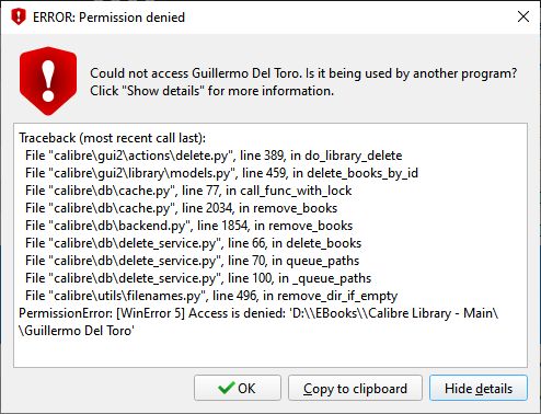 I copied my entire Calibre library to another folder on my drive, and opened a portable copy of Calibre. Tried deleting files. Here’s the error box contents: calibre, version 6.6.1 ERROR: Permission denied: Could not access Jieun Baek. Is it being used by another program? Click "Show details" for more information. Traceback (most recent call last): File "calibre\gui2\actions\delete.py", line 389, in do_library_delete File "calibre\gui2\library\models.py", line 459, in delete_books_by_id File "calibre\db\cache.py", line 77, in call_func_with_lock File "calibre\db\cache.py", line 2034, in remove_books File "calibre\db\backend.py", line 1854, in remove_books File "calibre\db\delete_service.py", line 66, in delete_books File "calibre\db\delete_service.py", line 70, in queue_paths File "calibre\db\delete_service.py", line 100, in _queue_paths File "calibre\utils\filenames.py", line 496, in remove_dir_if_empty PermissionError: [WinError 5] Access is denied: 'D:\\TEST\\Calibre Library - Main\\Jieun Baek' -------------------8< These files are definitely not in use by another program. Tried checking permissions, and don’t see anything out of the ordinary. As suggested, I tried LockHunter, and I’m not sure if I understand it correctly, but pointed it to my library folder, and ran it. I’m not sure if it recursively unlocks all files in the library, but in any event, it didn’t work. One notable point is that for every book I tried to delete, a temporary folder was created under my main library. I.e. D:\TEST\Calibre Library – Main D:\TEST\Calibre Library - Main deleted 1sy0qdr2 D:\TEST\Calibre Library - Main deleted ku0eowm7 etc. EDIT: I tried copying my library to a flash drive and opening it. I was able to delete books without an error message. So I'm not sure what could cause this same library to error out on my D: drive? Last edited by VelvetElvis; 10-13-2022 at 11:29 PM. |