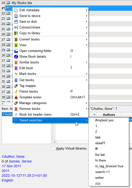 ![]() An action to display a menu of saved searches (named Saved Searches) is now in calibre source. It can be added to the toolbar, the menu bar, or the book context menu, etc. It can be given a keyboard shortcut. Favourites sees it so it can be added to the Favourites menu. This is something I will use so I had the incentive to go this far. Last edited by chaley; 10-17-2022 at 07:25 PM. Reason: Added shortcut possiblity. |