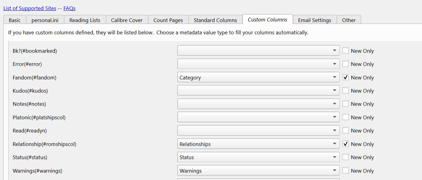 Sorry to bother you again. I've a little issue with two Yes/No custom columns after I install the new update for both Fanficfare (v4.17.0) and Calibre (v6.7.1.) One column used to show if I'd Bookmarked a story in Ao3 and in the other I manually indicate if I've read a story. After updating, the result of the Bookmarked column is duplicated in the read column. I've been checking default.ini in case there's something I need to remove or change from my personal.ini but I can't figure it out. Code: